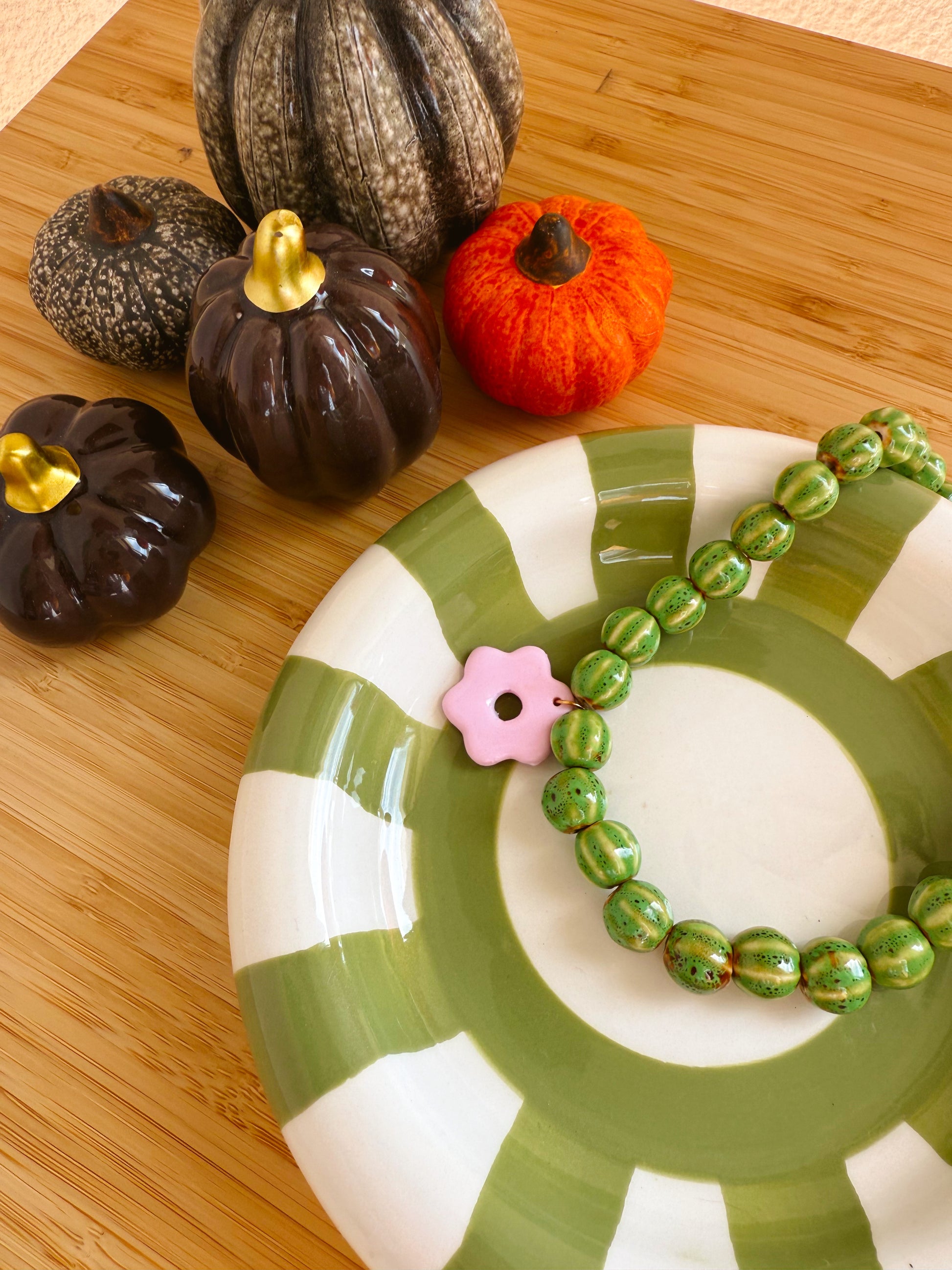 Fleur fabriquée à la main en pâte polymère, perles en céramique, chaîne de rallonge en acier inoxydable.