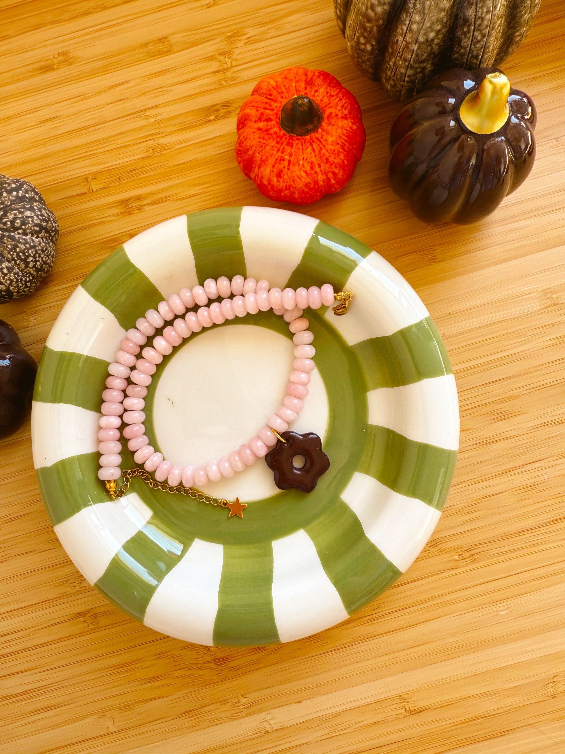 Perles en pierres naturelles, fleur fabriquée à la main en pâte polymère, chaîne de rallonge en acier inoxydable.